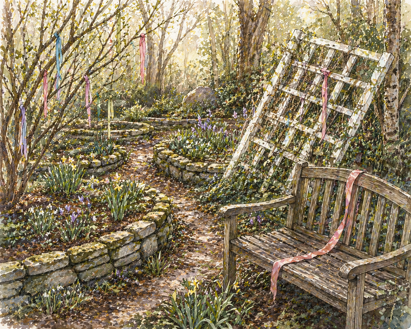 Stone borders softened with time. Green shoots pushed through the soil. A trellis leaned gently to one side.